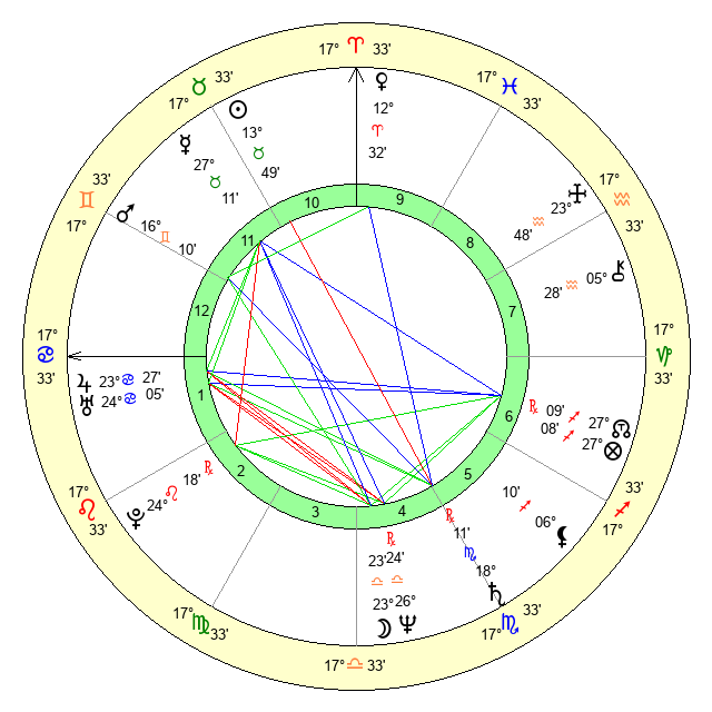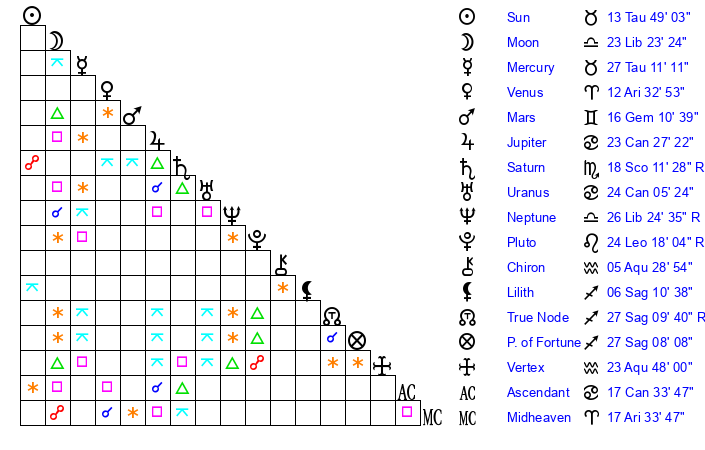 | Moon | 23 Libra 16 | 20 Leo 54 | 6 Taurus 43 |