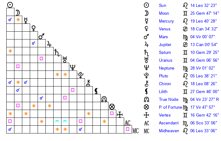 | Mercury | 19 Leo 41 | 4 Leo 56 | 17 Libra 45 |