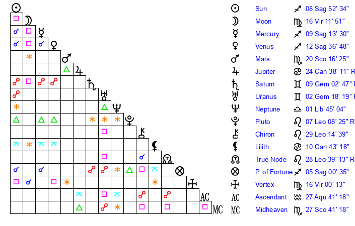 | Venus | 12 Sagittarius 37 | 1 Sagittarius 5 | 26 Pisces 33 |