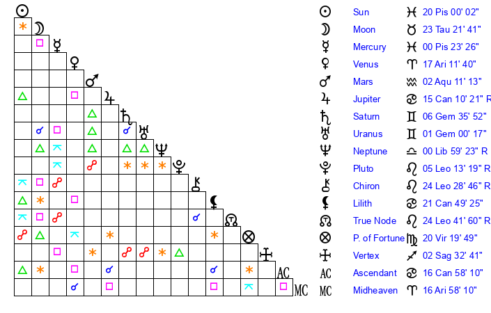 | Sun | 20 Pisces 0 | 21 Pisces 7 | 10 Gemini 5 |