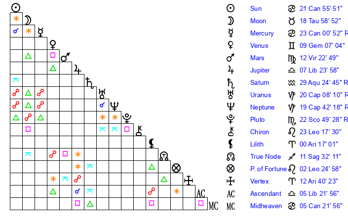 | Moon | 18 Taurus 52 | 5 Pisces 12 | 19 Cancer 28 |