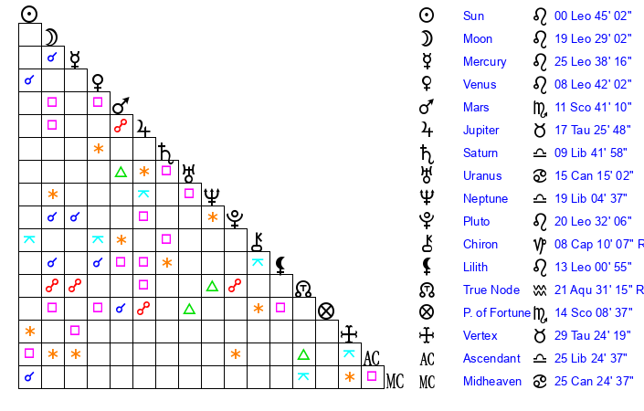 | Sun | 0 Leo 45 | 1 Leo 5 | 11 Libra 24 |
