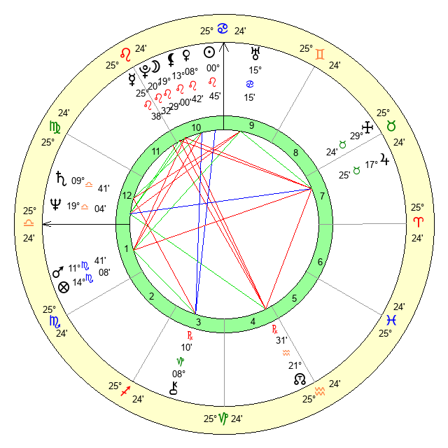| Moon | 19 Leo 30 | 16 Cancer 48 | 27 Aries 34 |