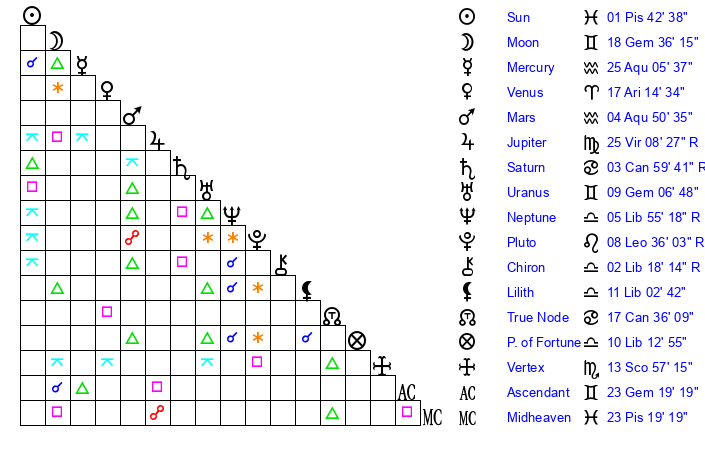 | Neptune | 5 Libra 56 | 28 Pisces 35 | 3 Libra 57 |