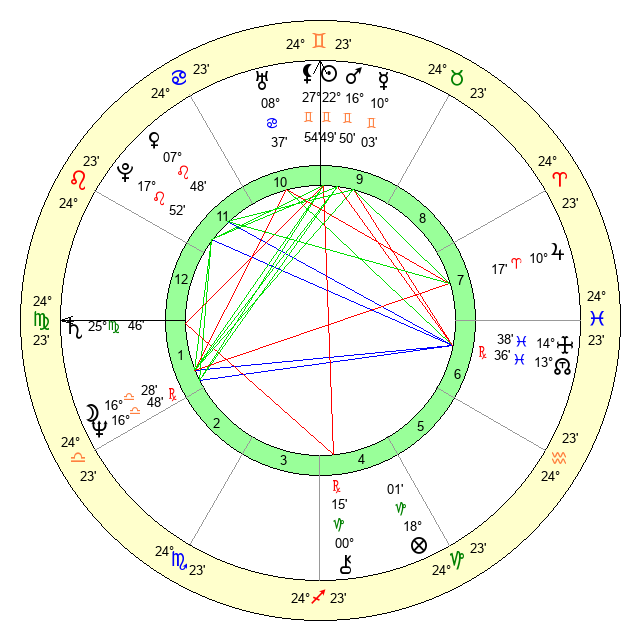 | Moon | 16 Libra 25 | 3 Aquarius 15 | 9 Cancer 34 |