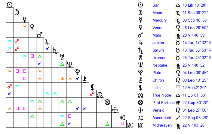 | Mars | 28 Virgo 47 | 7 Scorpio 43 | 24 Scorpio 33 |