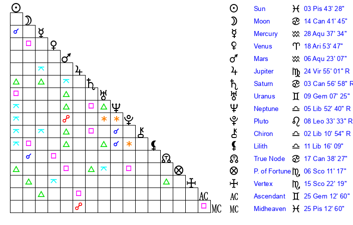 | Moon | 14 Cancer 41 | 26 Sagittarius 33 | 18 Gemini 12 |