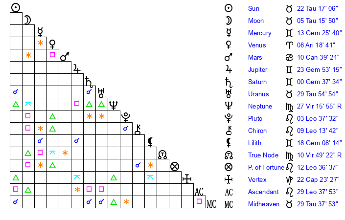 | Moon | 5 Taurus 6 | 4 Sagittarius 13 | 20 Taurus 7 |