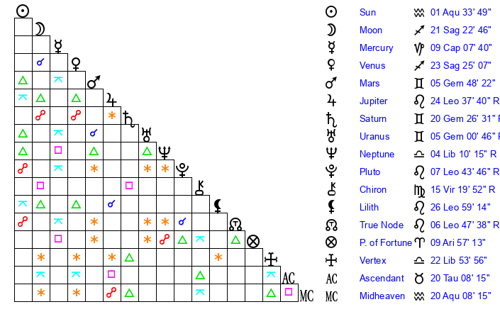 | Saturn | 20 Gemini 47 | 16 Pisces 23 | 22 Gemini 24 |