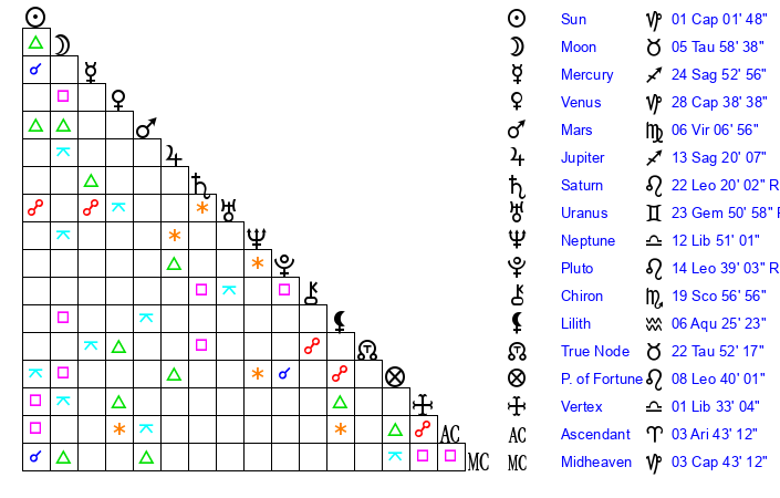 | Pluto | 14 Leo 38 | 2 Aquarius 28 | 12 Leo 58 |