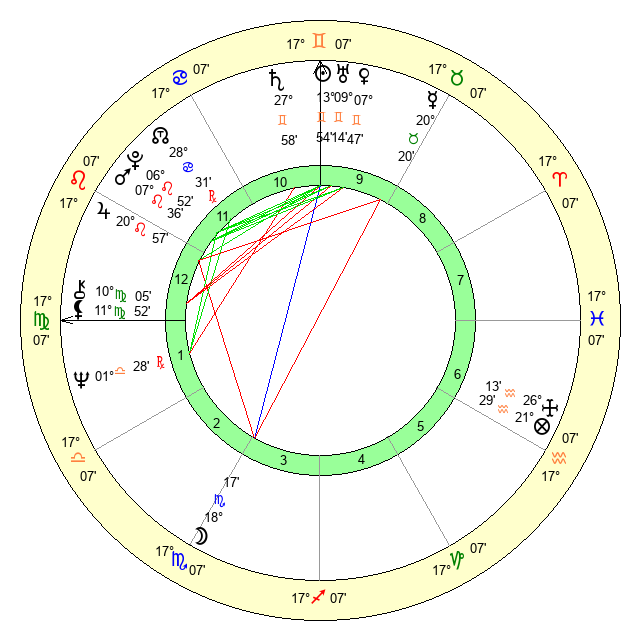 | Sun | 13 Gemini 55 | 14 Gemini 19 | 1 Virgo 23 |