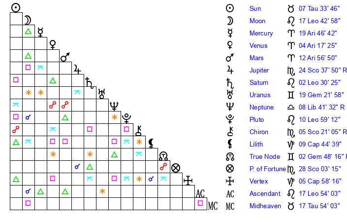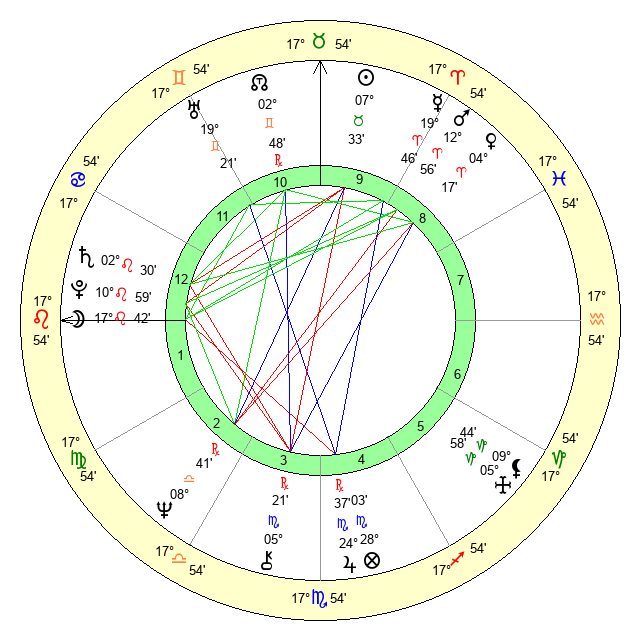 | Moon | 17 Leo 49 | 21 Taurus 28 | 17 Gemini 24 |