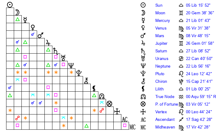 | Sun | 5 Libra 16 | 5 Libra 49 | 17 Sagittarius 20 |