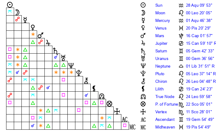 | Sun | 28 Aquarius 10 | 29 Aquarius 17 | 19 Taurus 9 |