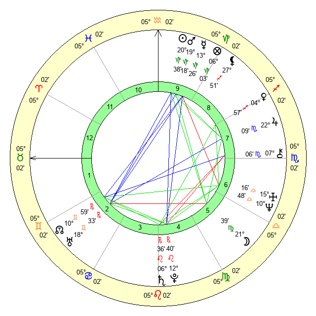| Moon | 21 Virgo 37 | 23 Gemini 27 | 22 Cancer 51 |