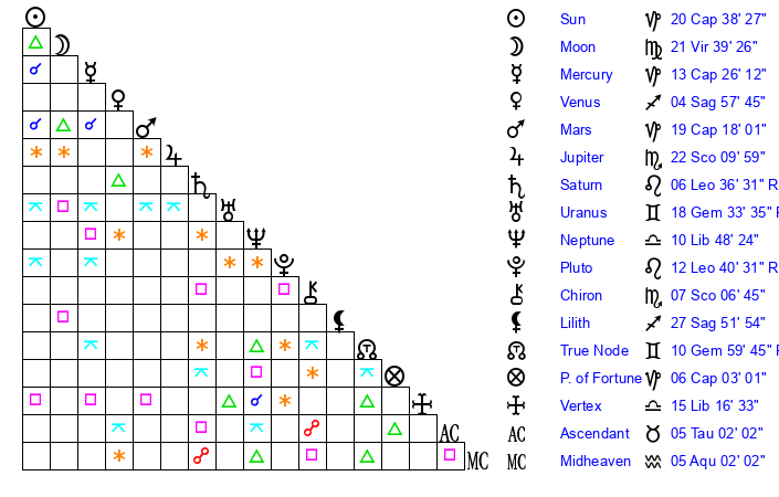 | Sun | 20 Capricorn 38 | 21 Capricorn 44 | 9 Aries 9 |