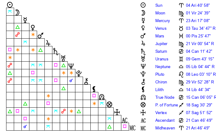 | Moon | 1 Virgo 19 | 14 Aquarius 24 | 7 Leo 34 |