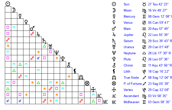 | Moon | 16 Virgo 54 | 6 Aquarius 4 | 15 Pisces 43 |