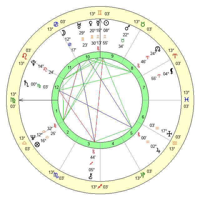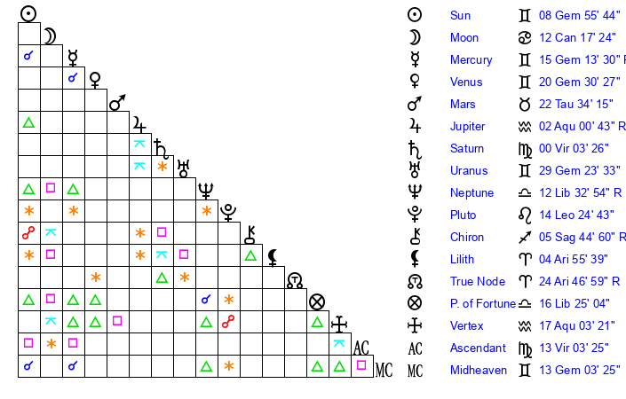 | Mercury | 15 Gemini 13 | 10 Gemini 12 | 9 Virgo 13 |