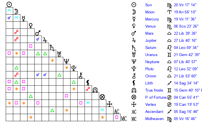 | Sun | 20 Virgo 17 | 21 Virgo 9 | 8 Sagittarius 55 |