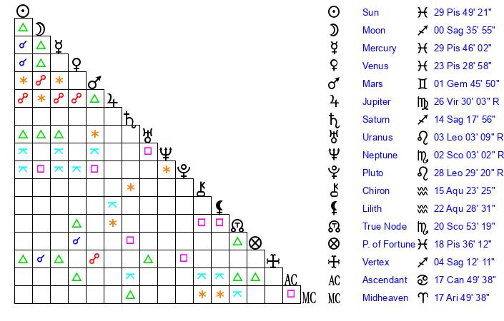 | Saturn | 14 Sagittarius 43 | 23 Pisces 2 | 11 Sagittarius 52 |