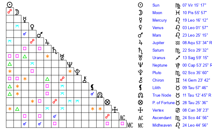 | Moon | 10 Pisces 50 | 1 Sagittarius 28 | 16 Leo 5 |