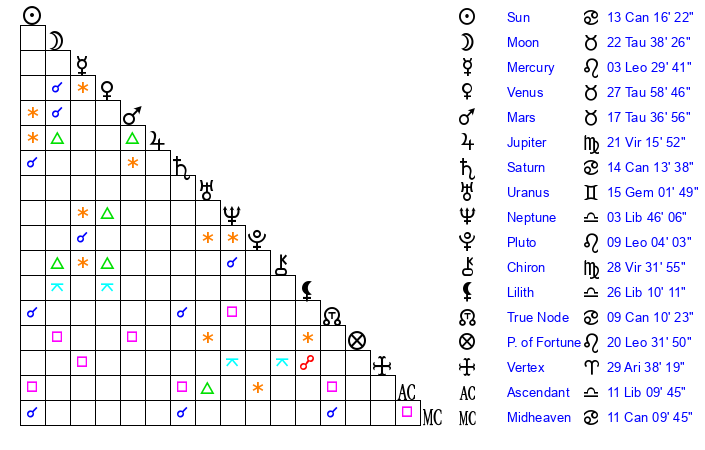 | Moon | 22 Taurus 34 | 15 Scorpio 30 | 26 Aries 4 |