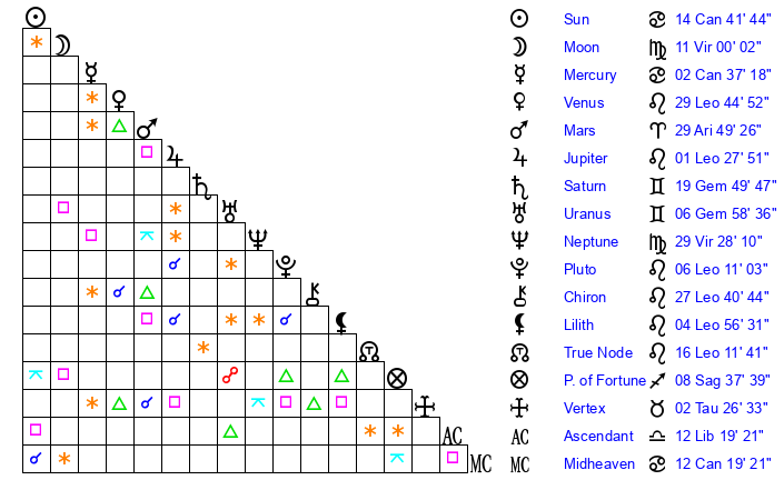 | Moon | 10 Virgo 57 | 9 Sagittarius 30 | 13 Virgo 49 |
