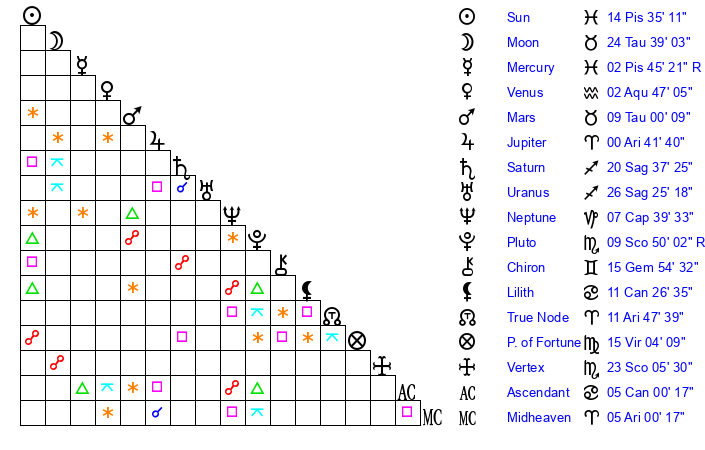 | Sun | 14 Pisces 35 | 15 Pisces 22 | 22 Aries 15 |