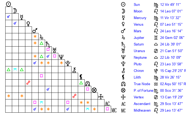 | Moon | 14 Leo 1 | 16 Aquarius 53 | 25 Pisces 30 |