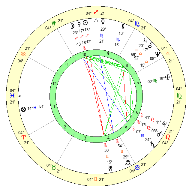 | Venus | 29 Scorpio 21 | 6 Sagittarius 7 | 9 Pisces 51 |
