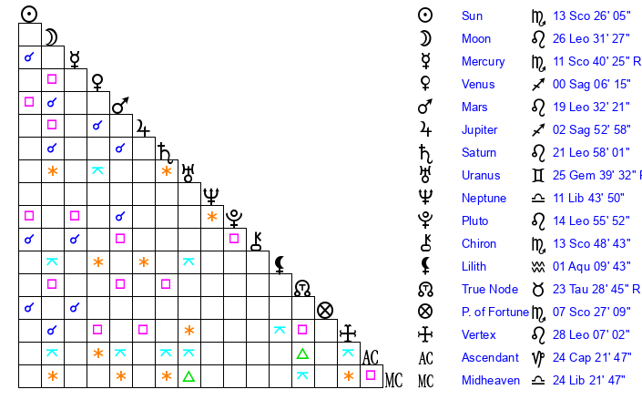 | Sun | 13 Scorpio 26 | 14 Scorpio 32 | 2 Aquarius 37 |