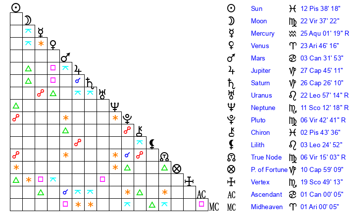 | Moon | 22 Virgo 42 | 0 Taurus 8 | 29 Capricorn 45 |