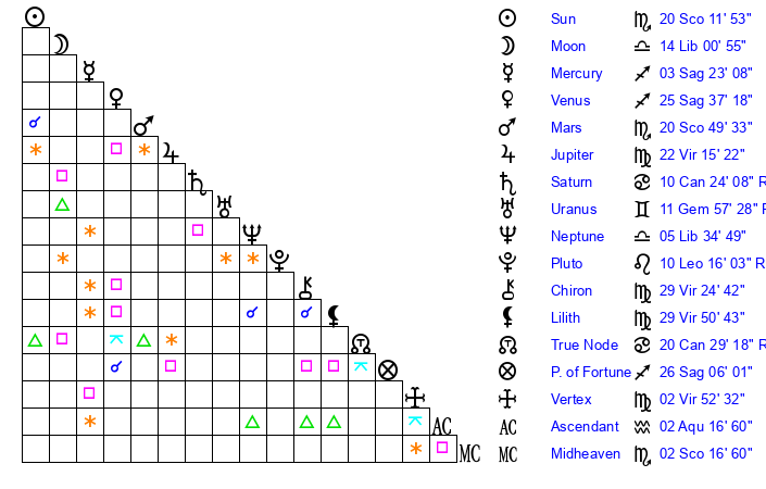 | Neptune | 5 Libra 36 | 29 Pisces 34 | 6 Libra 16 |