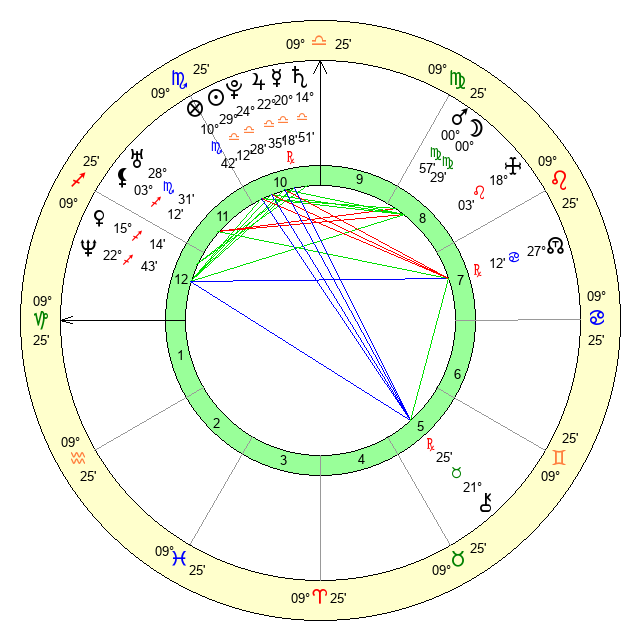 | Moon | 0 Virgo 23 | 12 Scorpio 33 | 26 Pisces 9 |