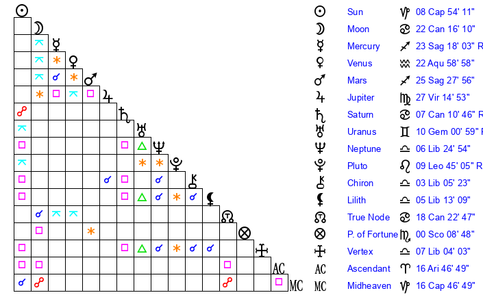 | Moon | 22 Cancer 12 | 17 Taurus 44 | 11 Cancer 45 |