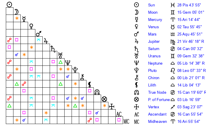 | Sun | 28 Pisces 44 | 29 Pisces 20 | 16 Gemini 33 |