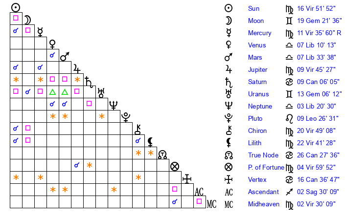| Sun | 16 Virgo 52 | 17 Virgo 16 | 7 Sagittarius 22 |