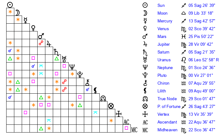 | Sun | 5 Sagittarius 26 | 5 Sagittarius 42 | 15 Aquarius 38 |