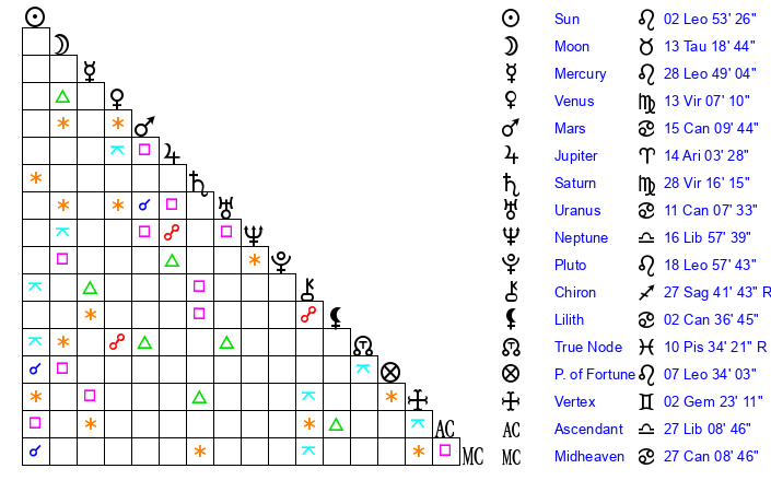 | Moon | 13 Taurus 23 | 27 Leo 48 | 23 Capricorn 52 |