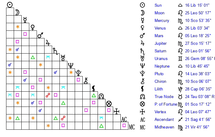 | Sun | 16 Libra 15 | 17 Libra 21 | 4 Capricorn 48 |