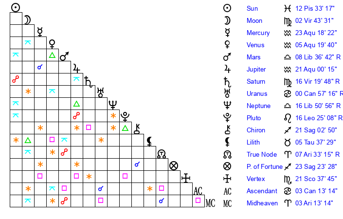 | Saturn | 16 Virgo 53 | 20 Pisces 57 | 13 Virgo 7 |