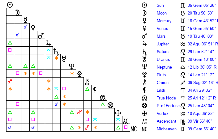 | Sun | 5 Gemini 6 | 5 Gemini 42 | 17 Leo 43 |