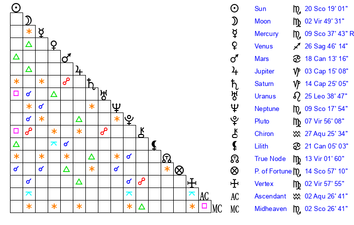 | Neptune | 9 Scorpio 17 | 29 Pisces 34 | 11 Scorpio 7 |