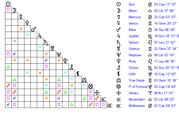 | Jupiter | 18 Scorpio 10 | 3 Cancer 37 | 22 Scorpio 12 |