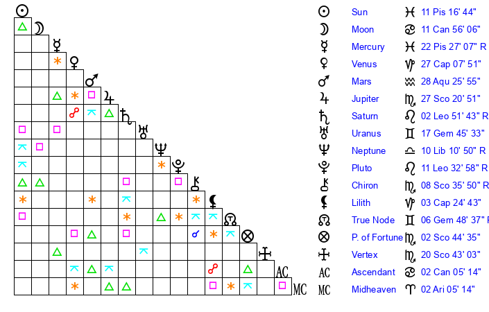 | Mercury | 22 Pisces 27 | 29 Pisces 0 | 2 Gemini 30 |