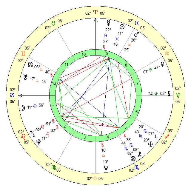 | Moon | 12 Cancer 10 | 19 Aries 6 | 16 Taurus 6 |