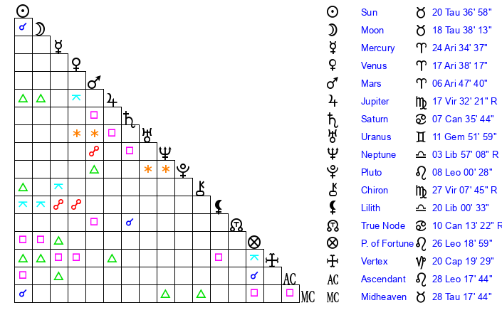 | Sun | 20 Taurus 37 | 21 Taurus 15 | 7 Leo 8 |