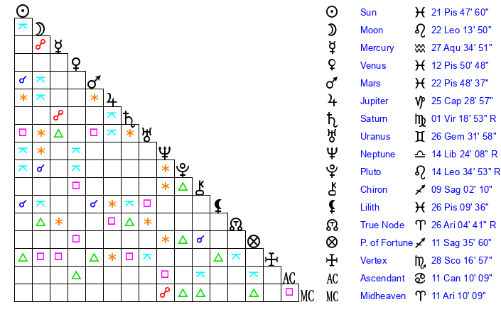 | Neptune | 14 Libra 23 | 29 Pisces 19 | 12 Libra 34 |