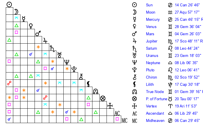 Pluto | 12 Leo 6 | 2 Aquarius 59 | 14 Leo 17 |